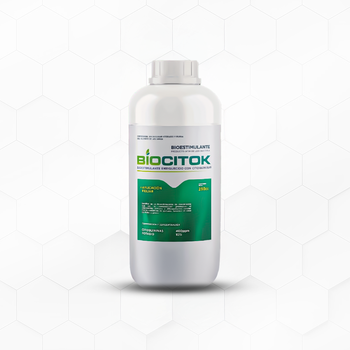 BIOCITOK es un potente regulador de crecimiento vegetal formulado con citoquininas y potasio. Promueve el desarrollo de yemas, espigas y flores, mejora el amarre de fruto y potencia el engrose y sabor. También fortalece el sistema radicular al aplicarse al suelo, incrementando la absorción de nutrientes. Es compatible con fertilizantes y fitosanitarios, ideal para aumentar rendimiento y calidad​.